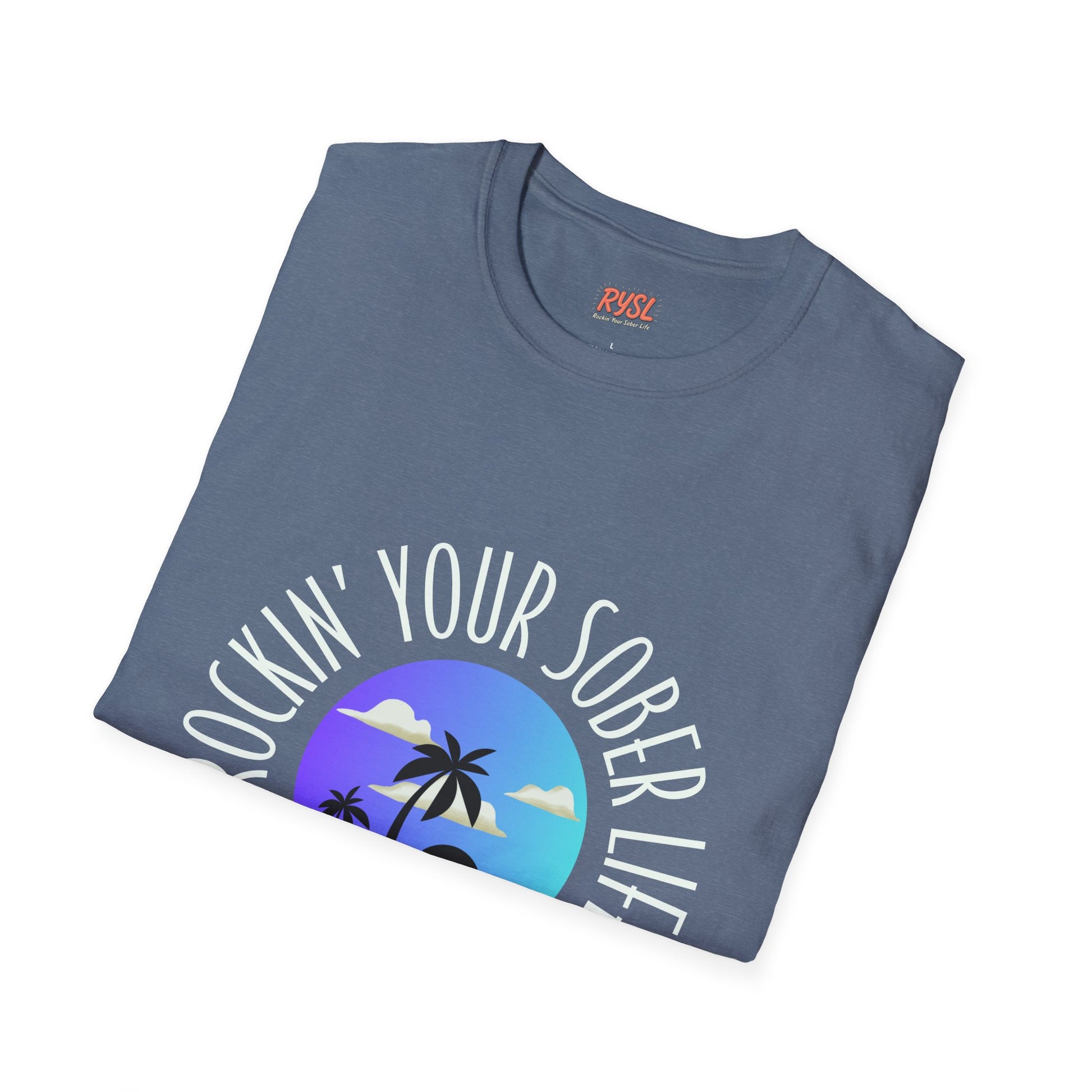 Say hello to your new favorite tee — the RYSL Beach Life, made for those who are proudly living their best sober life. Featuring a vibrant sunset and playful palm tree artwork, this unisex softstyle t-shirt brings instant laid-back energy to whatever you're doing — beach day, brunch, or just chillin’ in the sunshine.