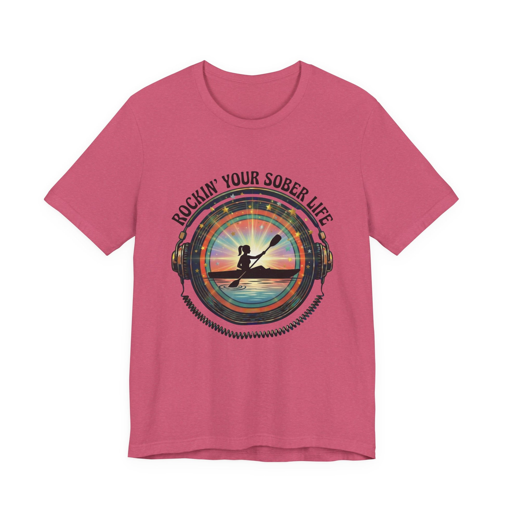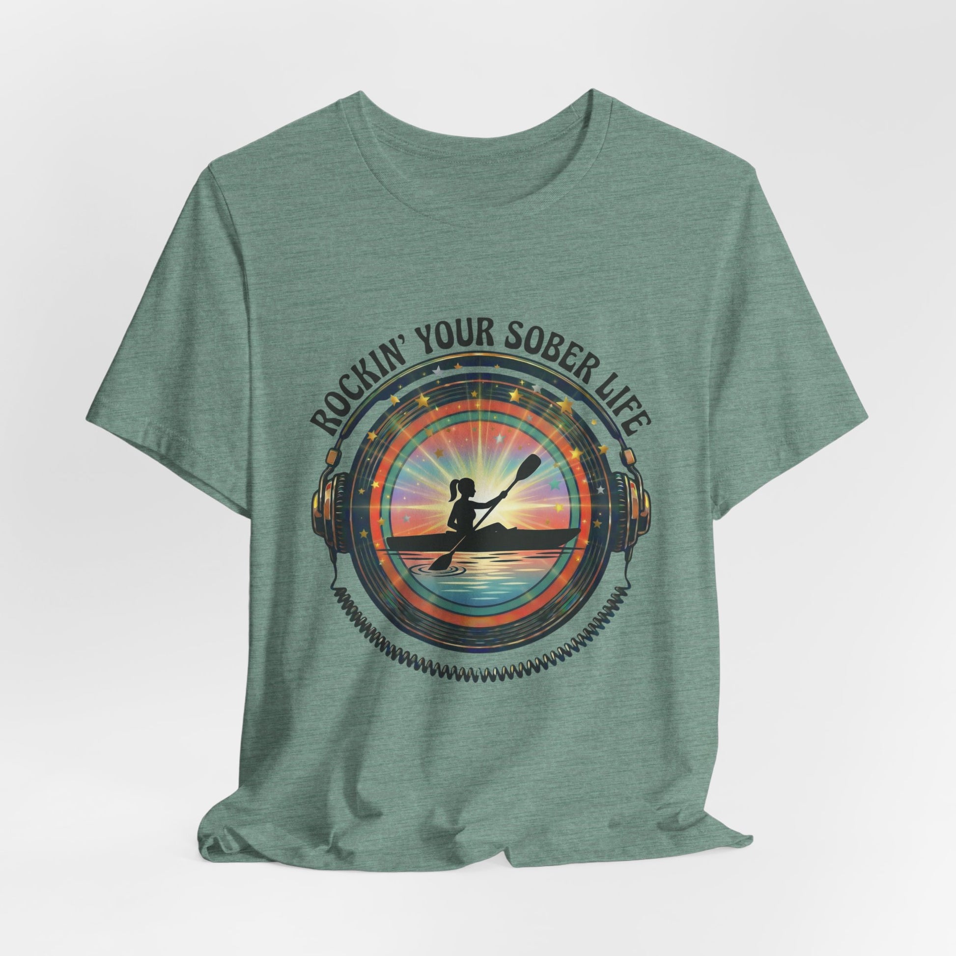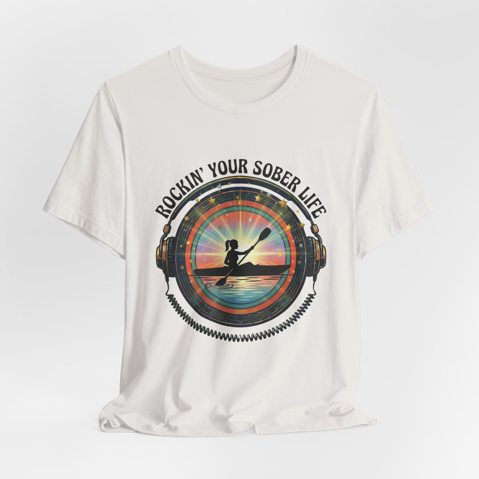 The Design Story: Our signature vinyl record frame with headphones wraps around a serene kayaking scene, symbolizing how sobriety lets you tune into life's natural rhythms. The vibrant sunset rays burst through in our brand colors (teal, purple, orange), creating a vintage-meets-modern aesthetic that stands out from typical recovery wear.